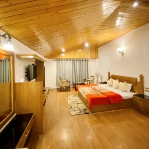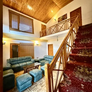 Step into our welcoming living space, where traditional Himachali charm meets modern comfort. The centerpiece of our cottage, this thoughtfully designed area features handcrafted pine wood furniture and an elegant wooden ceiling that creates a warm, inviting atmosphere.